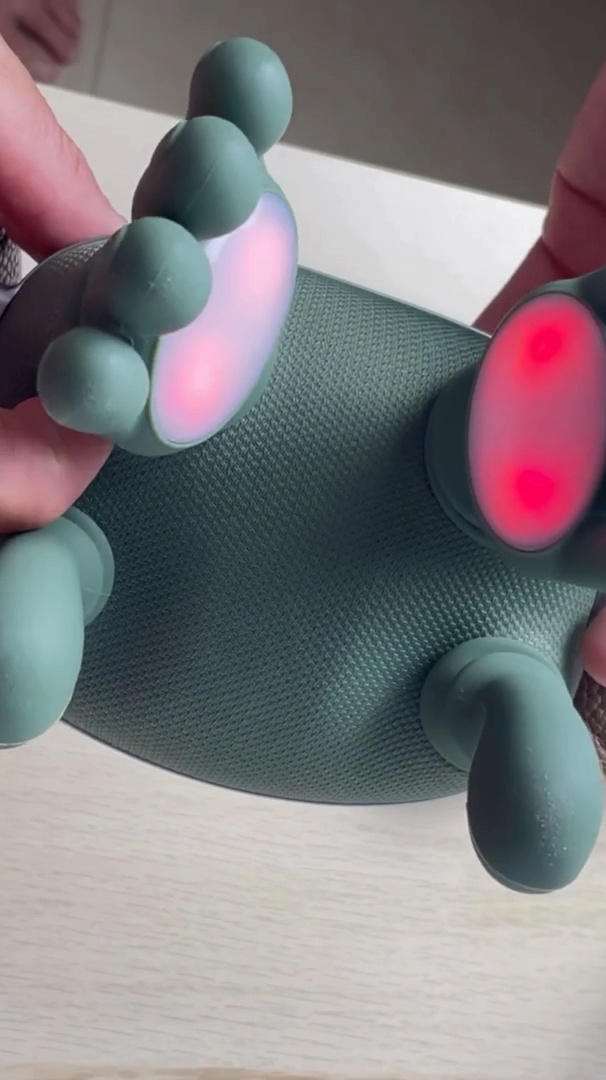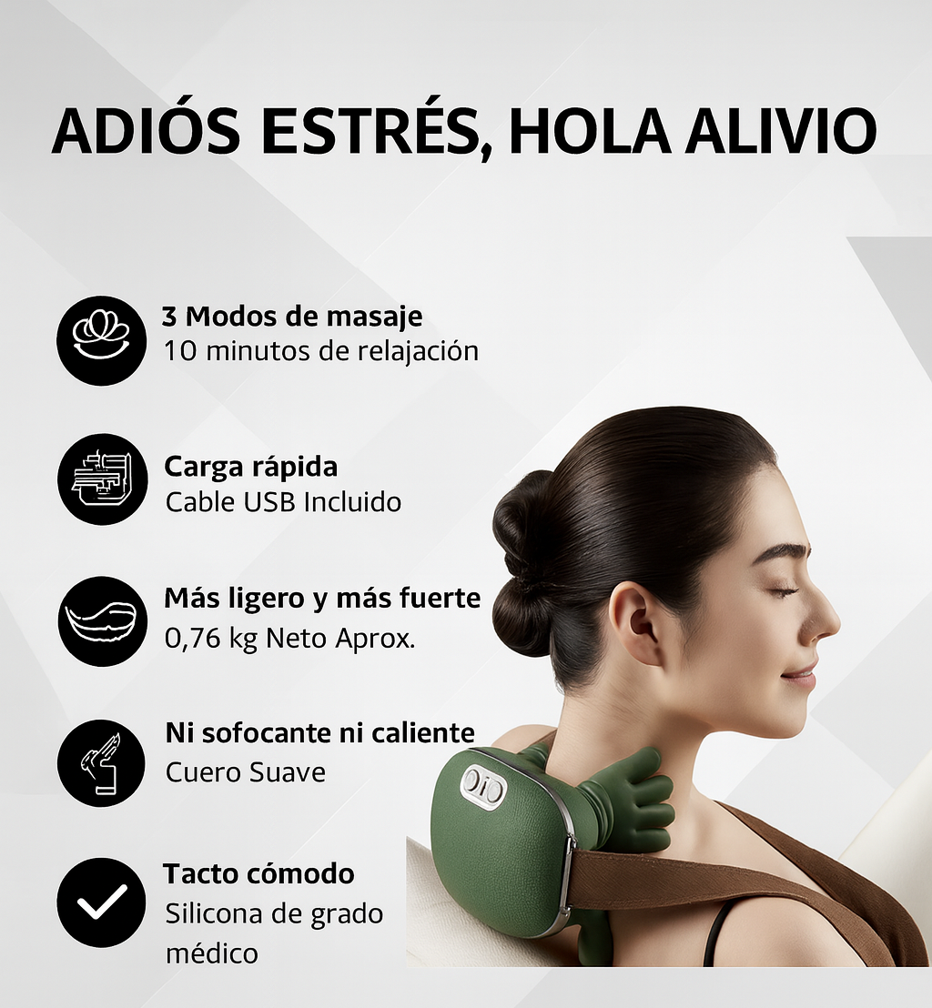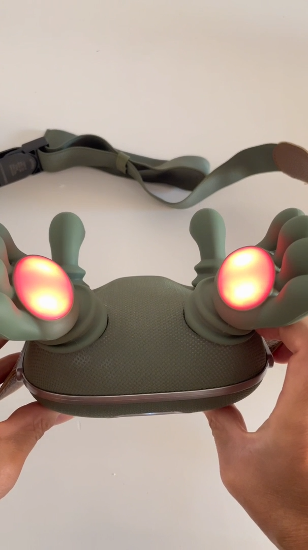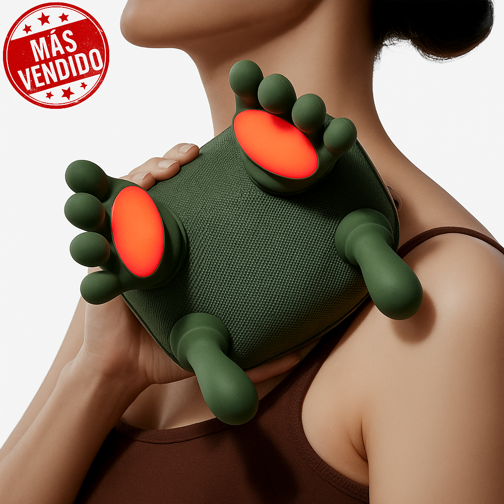 El masajeador simula manos reales con cuatro dedos para el cuello y un pulgar para los trapecios. Amasa y alivia la tensión mientras proporciona un masaje relajante.